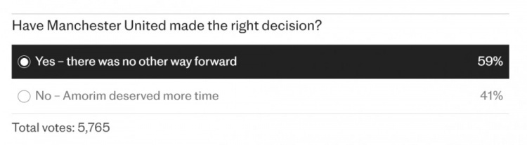 阿莫林该下课吗?电讯报投票:59%相沿罢免 41%反对+以为应给契机 发布日期:2026-01-12 22:05 点击次数:107 1月5日讯 曼联文告主帅阿莫林下课,《电讯报》就此发起投票,大部分球迷相沿曼联罢免阿莫林的决定。当今有5765名球迷参与这项投票,其中59%的球迷以为曼联罢免阿莫林是无奈之举,这是正确决定。41%的球迷则以为曼联不该罢免阿莫林,应该再给他时期。