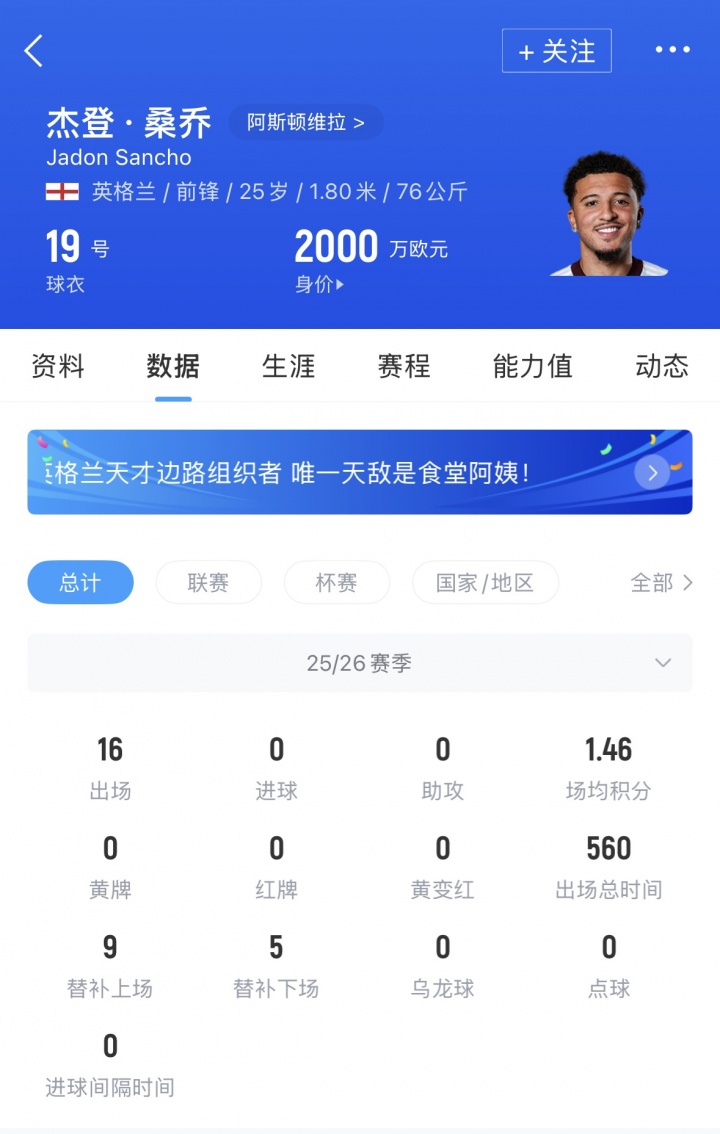 桑乔租出至维拉后当今各项赛事16场仍然0球0助,球员周薪20万镑维拉承担80%
