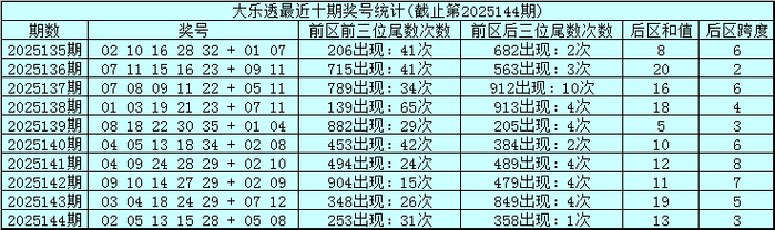 体彩大乐透第25144期奖号开出:02 05 13 15 28+05 08,前区奖号大小比为1:4,012路比为1:2:2,奇偶比为3:2,后区号码和值为13,跨度为3。