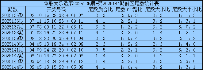 三少第2025145期体彩大乐透前区余数分析:
