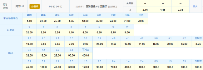竞彩官方径直开出大巴黎让2球的赔率组合为胜2.16、平4.15、负2.35,数据对大巴黎的守旧力度可见一斑。同期还开设了半全场玩法,大巴黎胜胜的赔率仍是低至1赔1.40,或者率半场就能搞定斗争。比分赔率中,大巴黎3-0取胜的赔率1赔7.2最低,2-0、2-1、3-1赢球的赔率均在1赔10以下。笼统来看,大巴黎或凭借丽都的迫切拿下迈阿密海外,大捷可期。