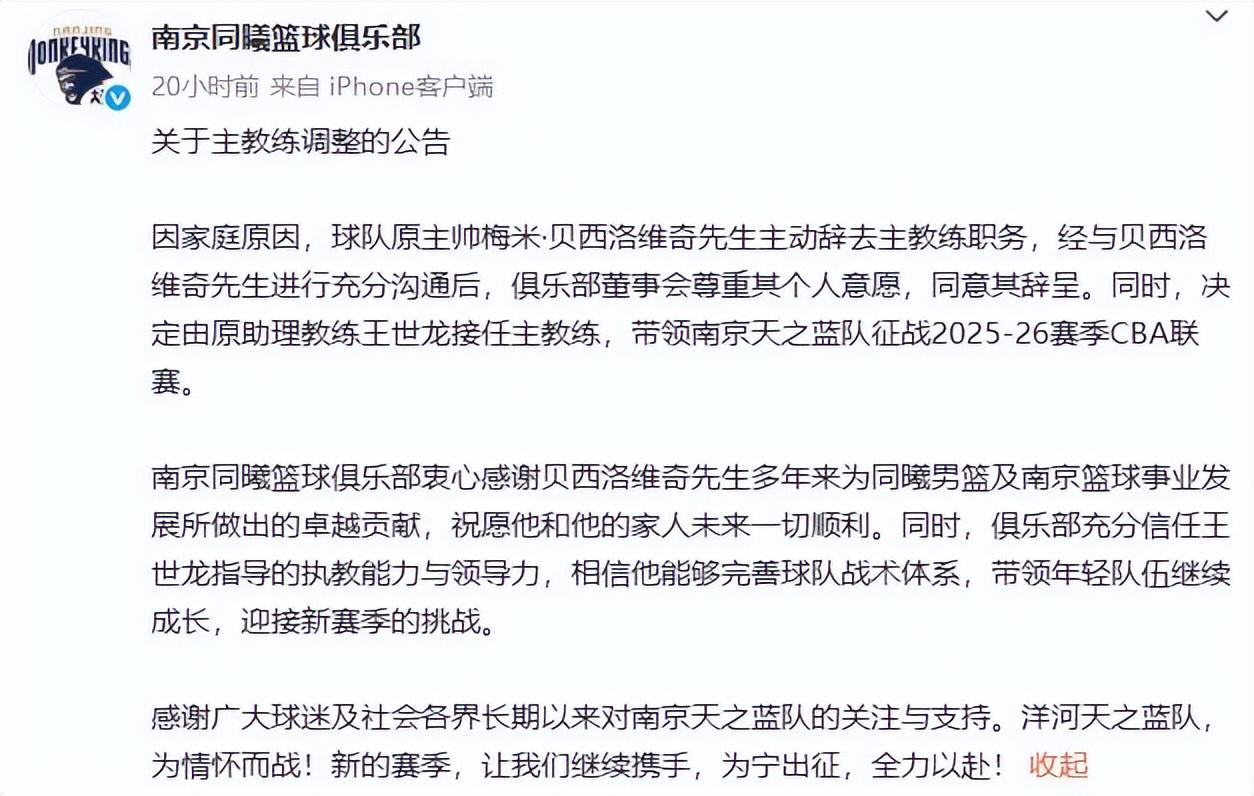 CBA联赛在12月12日就要开打,路易斯·金是第一位被裁掉的外助,不仅有外助走了,还有主栽植,南京天之蓝队官宣梅米·贝西洛维因为家庭原因也曾卸任主栽植的职务。王世龙接任主栽植,率领球队树立新赛季的联赛。