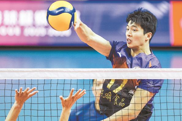 上海男排小将陆天铖在比赛中扣球 本报记者 李铭珅 摄