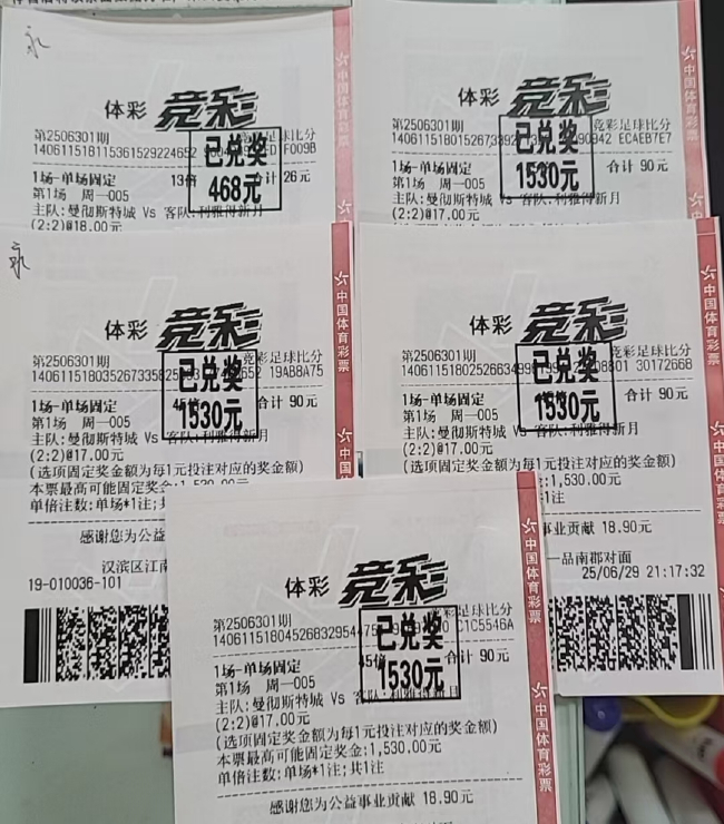 北京手艺7月1日,世俱杯1/8决赛第3比赛日,英超权门曼城旧例手艺2-2被亚洲独苗利雅得月牙逼平,爆6倍冷门,成为本届世俱杯淘汰赛于今头号大冷;凭证票面信息露出,来自陕西汉滨区的一位竞彩妙手,先后5张票共计193倍投单挑射中曼城2-2利雅得月牙比分,其中1张该比分固定奖金为1赔18,其余5张比分固定奖金为1赔17,共计铺张386元揽得6588元,酬劳率颇丰!