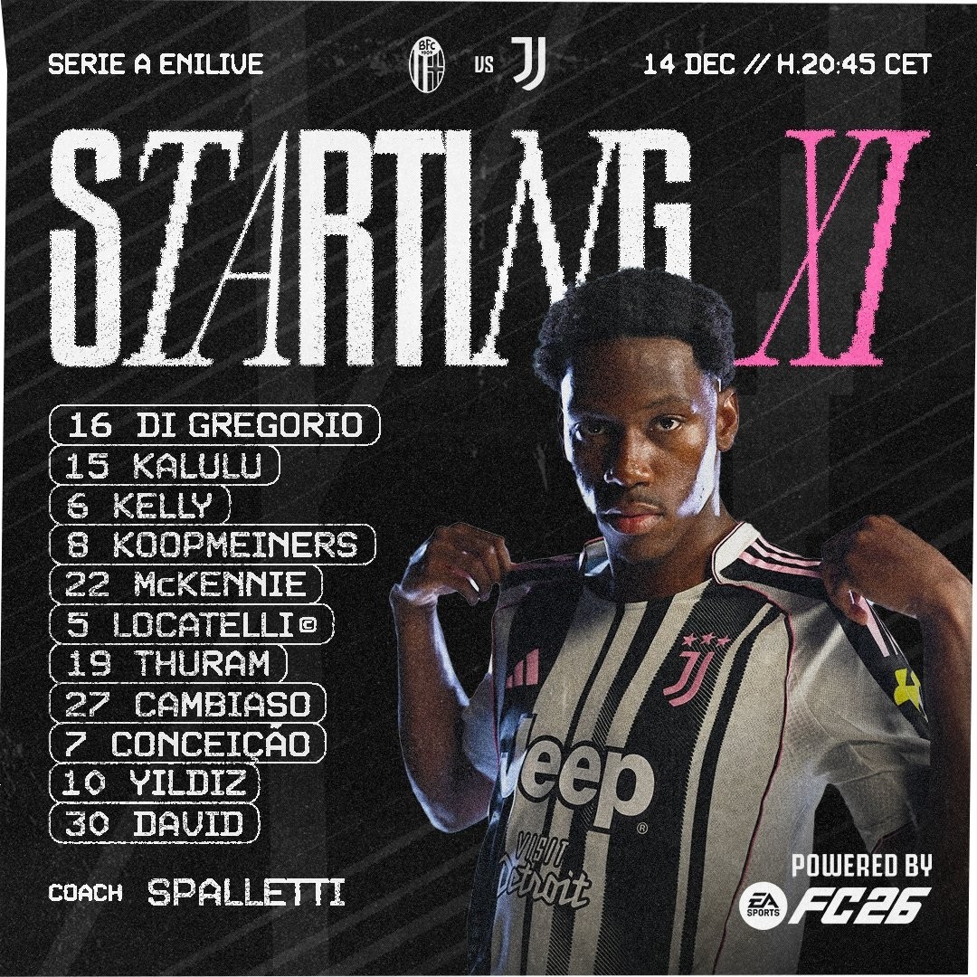 尤文首发:16-迪格雷戈里奥、15-卡卢卢、6-凯利、8-库普梅纳斯、22-麦肯尼、5-洛卡特利、19-图拉姆、27-坎比亚索、7-孔塞桑、10-伊尔迪兹、30-戴维