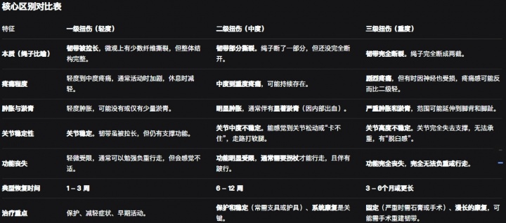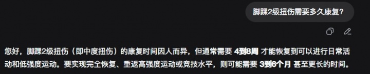 据AI分析,际遇脚踝2级扭伤(即中度扭伤)的康复时辰因东谈主而异,但频频需要4到8周智商复原到不错进行正常行径和低强度开通。要已毕统共复原、重返高强度开通或竞技水平,则可能需要3到6个月以致更长的时辰。