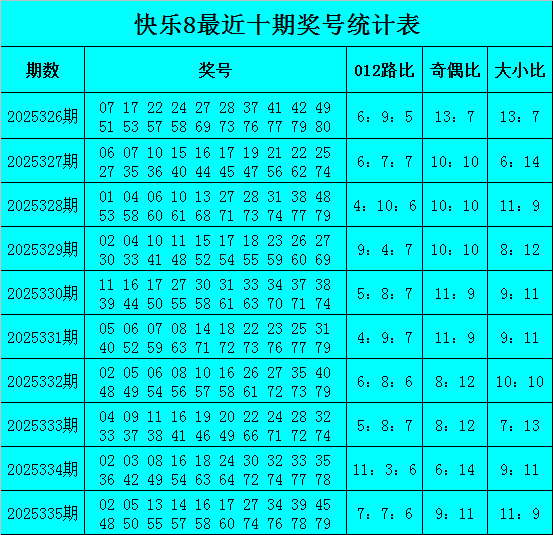福彩痛快8第2025335期开奖回归:02 05 13 14 16 17 27 34 39 45 48 50 55 57 58 60 74 76 78 79,其中奖号012路比为7:7:6,各路号码走势基本均衡。