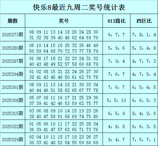 福彩欣忭8第2025329期(上周二)开奖回来:02 04 10 11 15 17 18 23 26 27 30 33 41 48 52 54 55 59 60 69,其中奖号四区比为7:5:7:1,012路比为9:4:7。