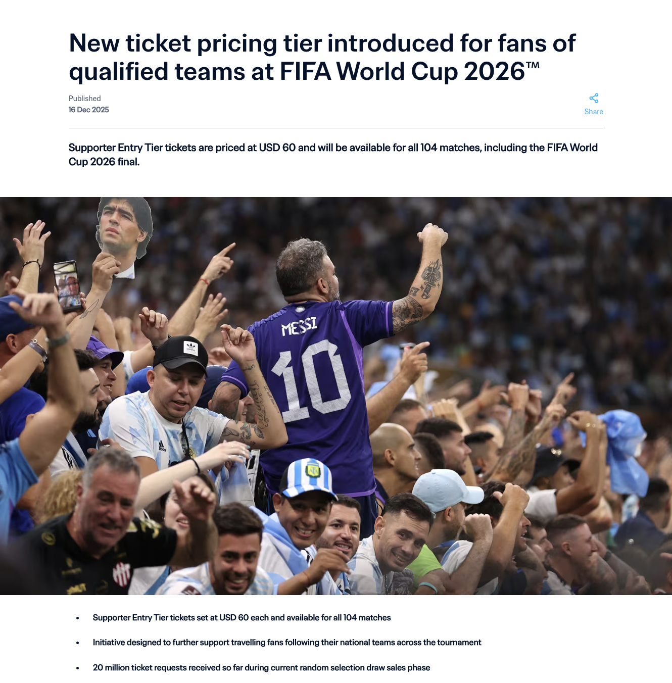 因寰球杯门票订价过高,遇到公论压力的海外足联(FIFA),于当地时辰12月16日发布调降票价公告。