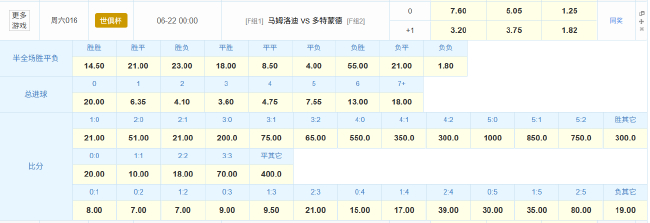 竞彩官方给本场世俱杯比拼给出7.60(马梅洛迪日落取胜)、5.05(平局)、1.25(多特取胜)的胜平负组合,显著赐与全体身价和名气占优的多特实力认同。比分竞猜玩法,多特2-0和2-1取胜同为1赔7最低,多特1-0、3-0、3-1分裂为1赔8、1赔9和1赔9.5紧随后来;两边1-1战平为1赔10,马梅洛迪日落1-0和2-1爆冷赢球最低同为1赔21,兑现难度不言而谕。接头到多特谢世俱杯小组赛首轮未能赢球争夺小组第1存在极大变数,第2轮濒临实力偏弱的非洲冠军马梅洛迪日落,多独有望拿到本届世俱杯首胜。(运道星)