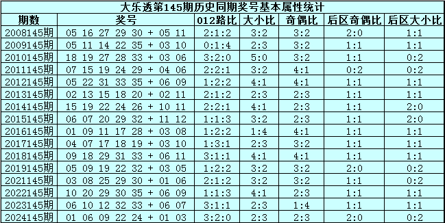 后区判断:后区第145期历史同时奖号大小比总比例为2:14,大号出现较少,本期看好大号回补,刺眼一大一小,两码参考05、07。